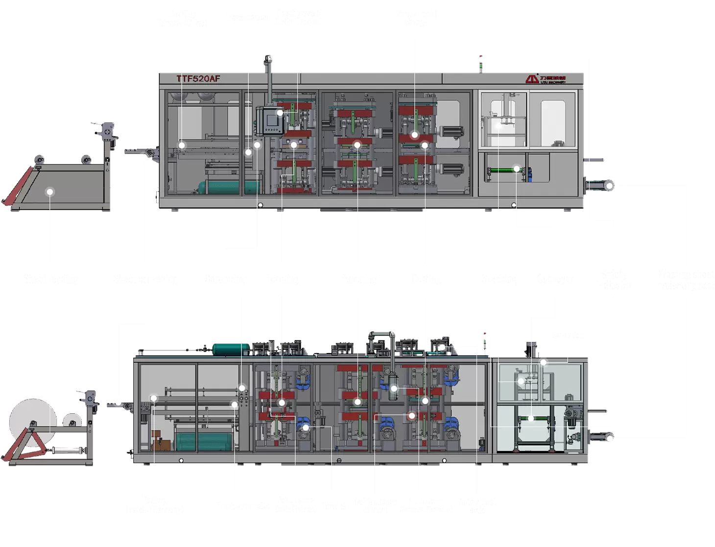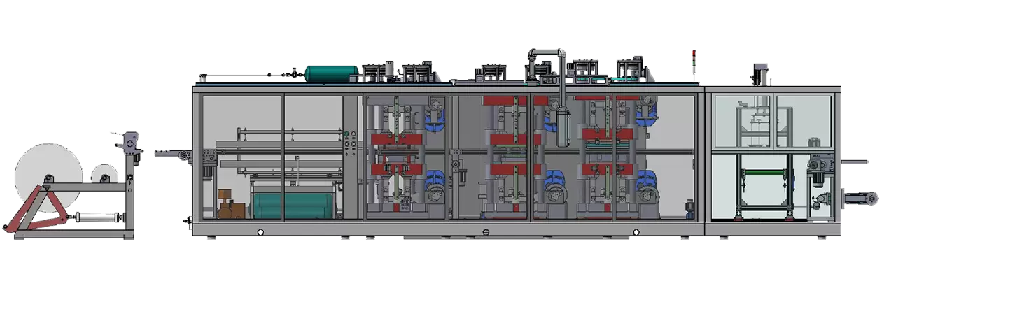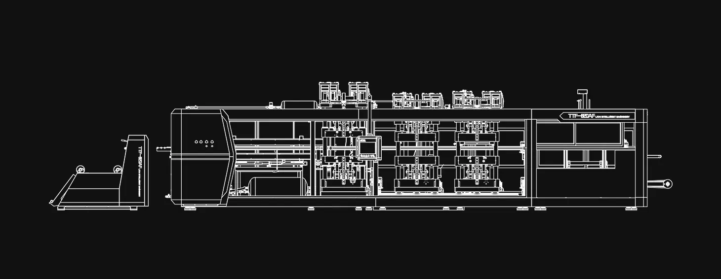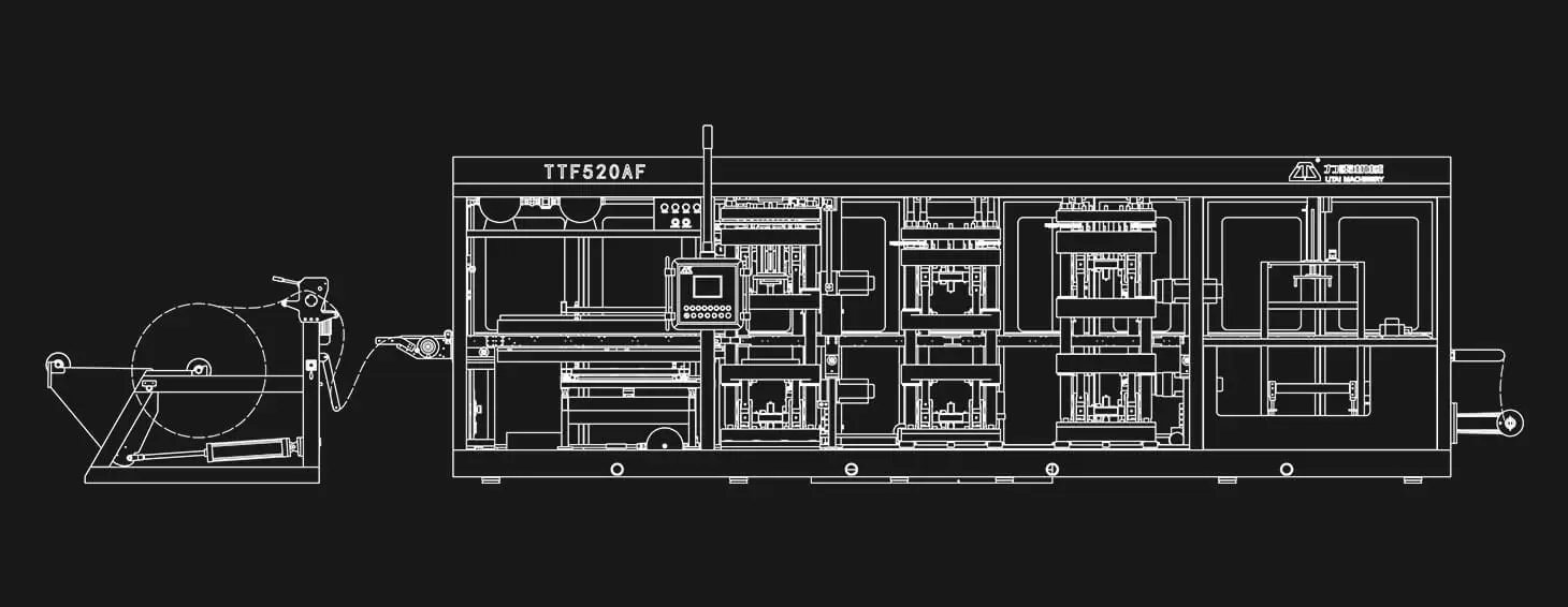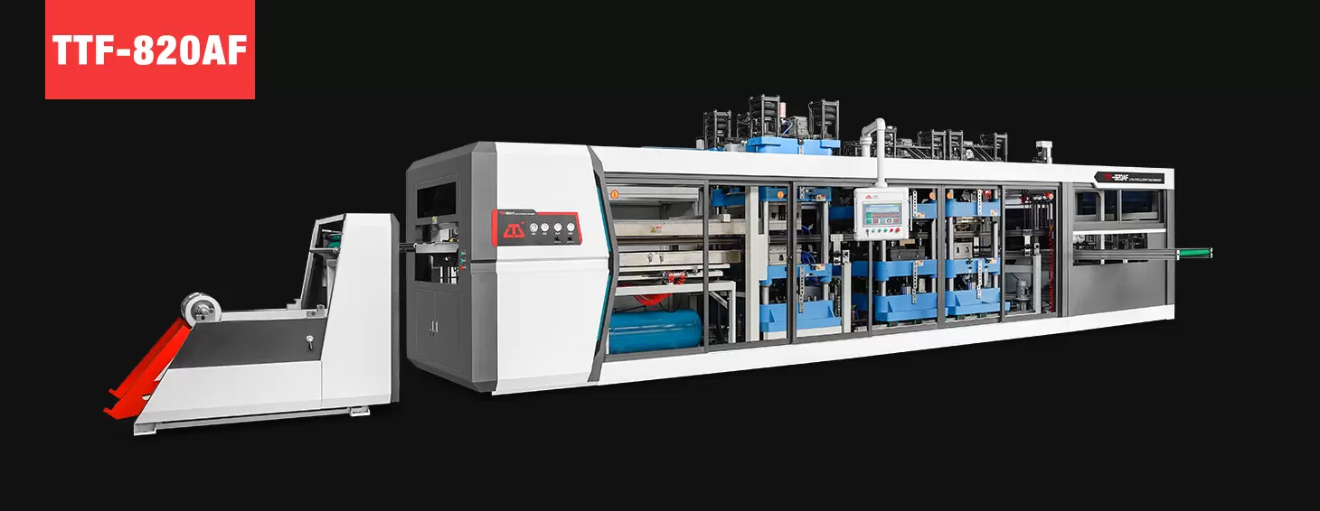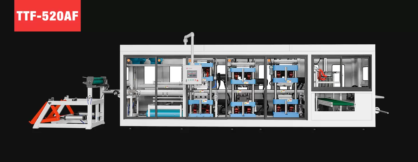 TTF系列全自动热成型机是我公司最新推出的 开发的核心产品。塑料热成型机集成型、冲孔、切割、堆叠为一体。用于生产一次性塑料制品。适合大多数客户的要求,可生产塑料托盘、翻盖容器、午餐盒、侧孔水果盒、盖子、安瓿托盘、草莓和蓝莓盒等带孔塑料容器。机器完全由伺服电机驱动。运行稳定,噪音低,效率高,质量高。