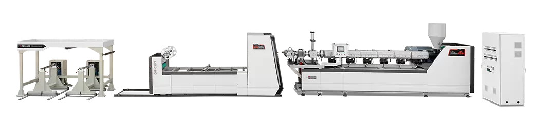 片材挤出机由挤出、压延、牵引、收卷等部件组成。主要易磨损部件经过优质特殊处理,耐腐蚀、耐高温。模头挤出流道阻力小,确保片材厚度均匀;三辊螺旋槽设计,确保有效冷却;液压装置更换和换网器安装无需停机即可轻松完成。