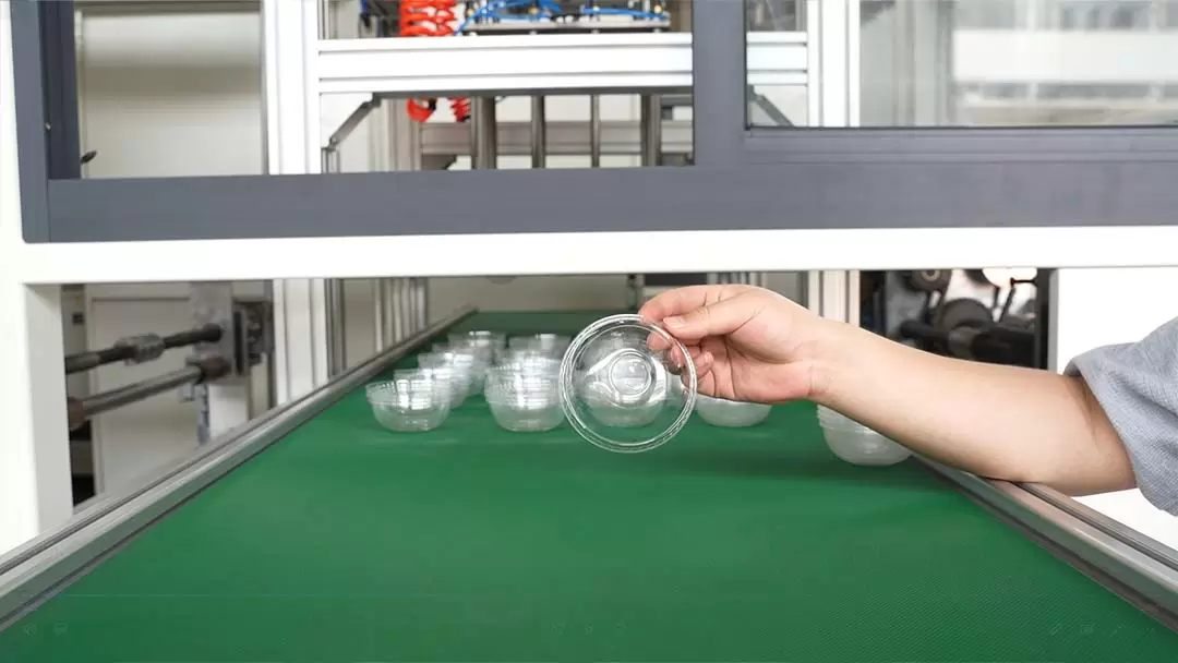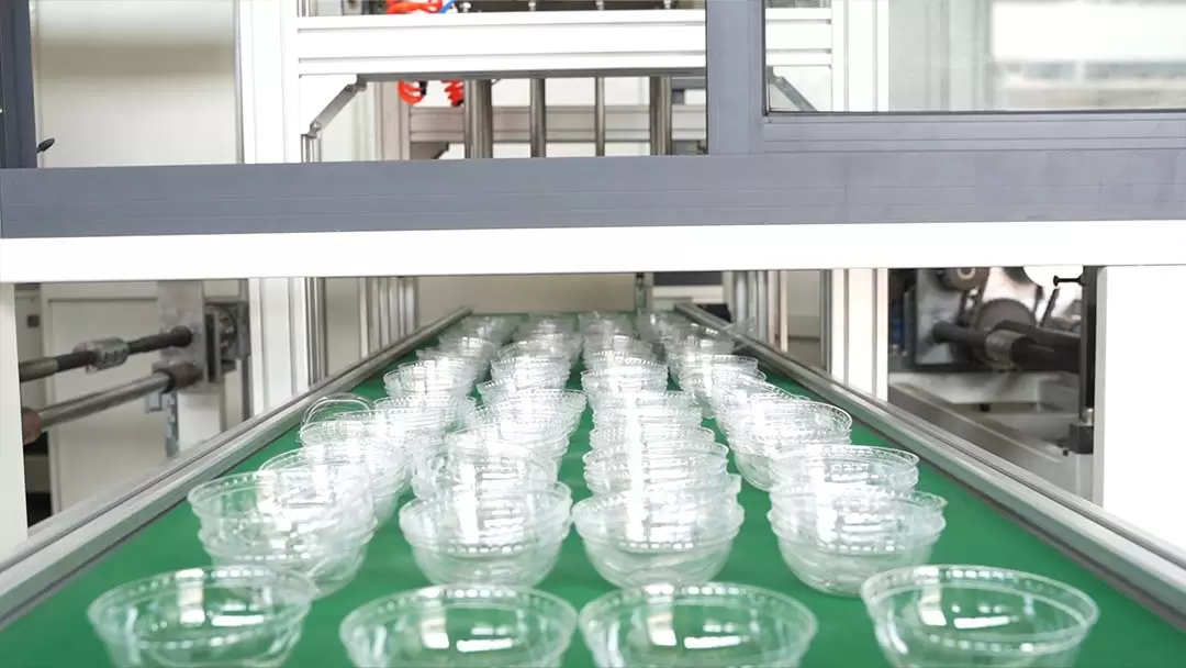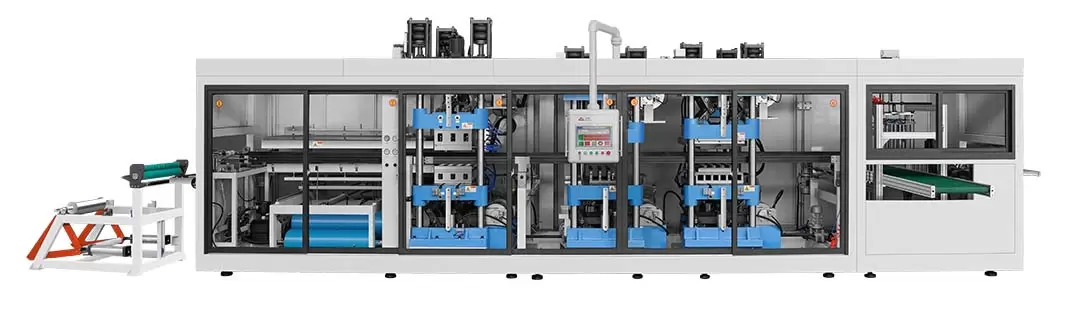 塑料热成型机集送料、加热、成型、冲孔、切割、堆垛、废料回收等功能于一体。
