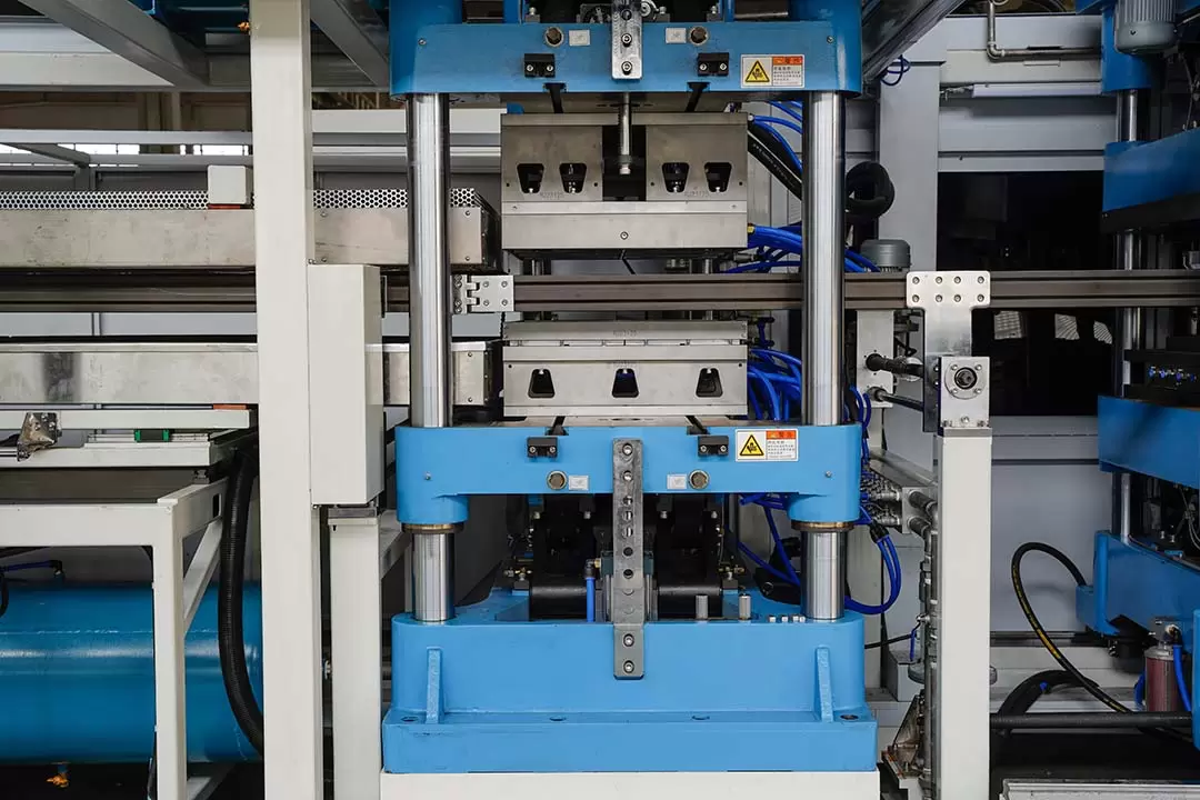 成型系统包括上模、下模以及真空或压力成型装置。加热后的片材进入成型区后,上下模快速闭合,通过真空吸力或压力将片材拉伸或压缩至模具形状,形成所需的产品形状。在此过程中,成型参数(如压力、时间等)可通过控制系统精确设定,以满足不同产品的成型要求。