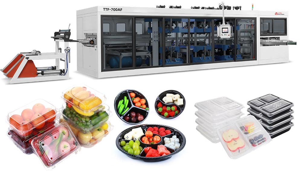 TTF系列全自动热成型机是我公司最新研发的核心产品。该机集成型、切割、堆叠于一体,应用广泛,可满足大多数客户的需求,可生产塑料托盘、容器、盒子、盖子等。该机完全由伺服电机驱动,运行稳定、噪音低、效率高、质量高。