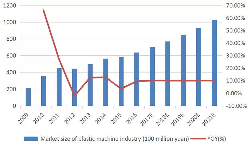 我国塑料机械行业已具备相当规模,目前,我国主要塑料机械产能已超过10万台套,其中挤出设备8000多台套,注塑机3万多台套,中空成型设备3000多台套,塑料机械年产值达80亿至100亿元。